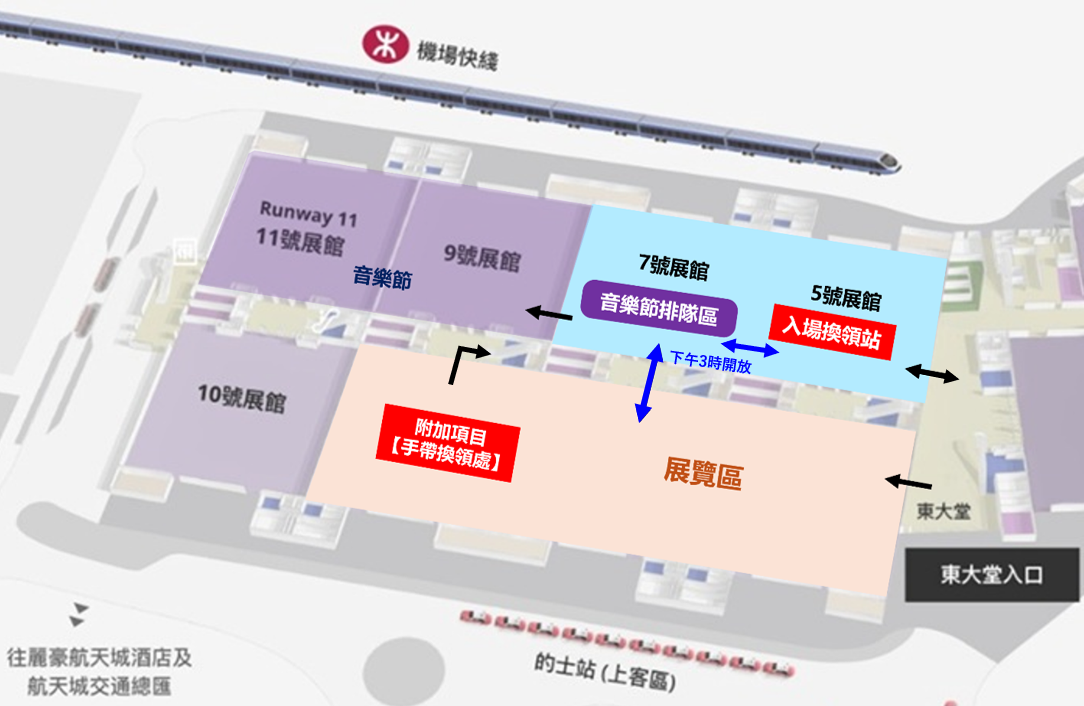 請先到【入場換領站】換領相應手帶 (如:展覽區/ 音樂節/ 場館手帶)、音樂節手燈 (如持有音樂節門票) - 為了人群控制和緊急管理,場館會向音樂節觀眾同時派發場館手帶。