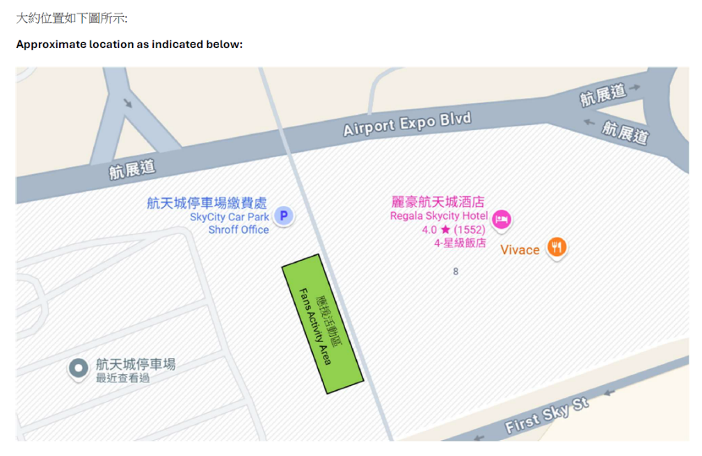 靠近麗豪航天城酒店天橋下設有戶外空地,可供閣下進行臨時應援活動,其開放時間為活動當天上午9:00至晚上8:00 (所有應援物品必須於活動當日清理),以先到先得方式安排,場館及主辦單位不會派員就位置進行分配。 由於相關地點接連停車場及通道,為確保人流暢通及維持秩序,場館保安會定時巡查場地及通道。 所有人士必須遵守及跟從保安人員指示,切勿阻塞通道或影響交通,切勿在行車通道上站立或停留,敬請注意安全,多謝合作。 針對任何販賣、非法或違反場館守則之行為,場館保安有權要求違規者離開。
